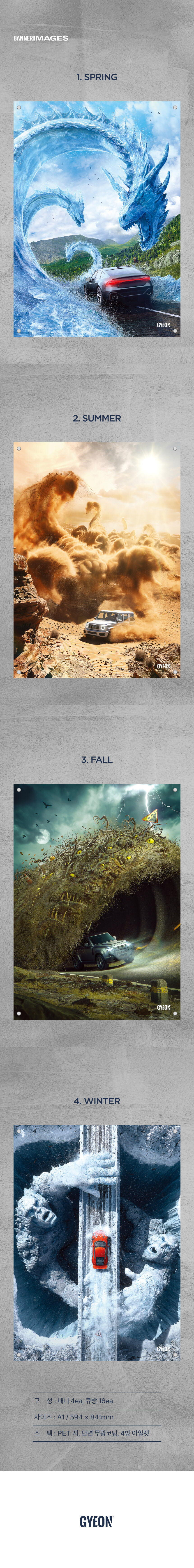 오리지널 그래픽 포스터 4 SEASONS 세트는 사계절에 걸쳐 자연 환경과 악천후를 견디는 자동차를 표현한 그래픽으로 디자인 되었습니다.